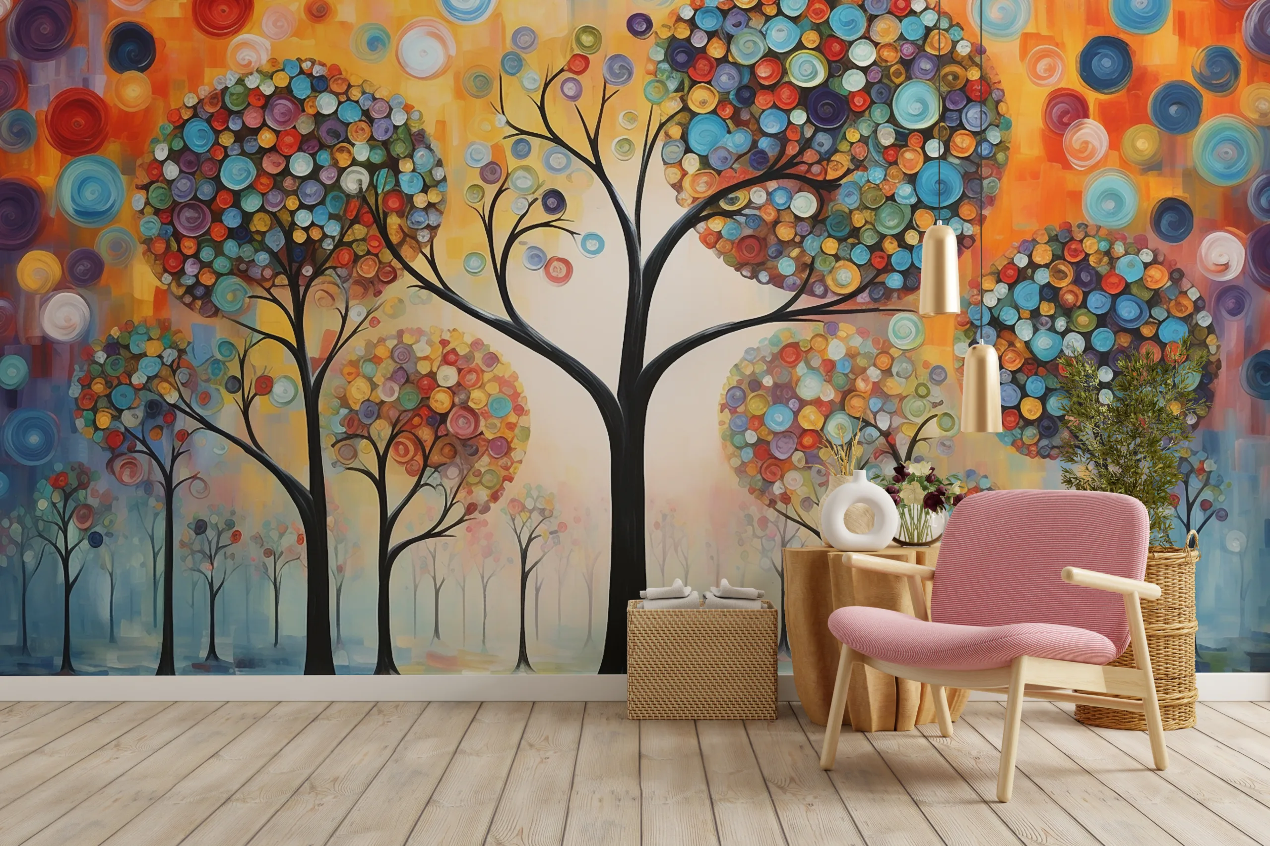 - Each tree seems to grow through circular patterns of color, reflecting movement, growth, and inspiration.