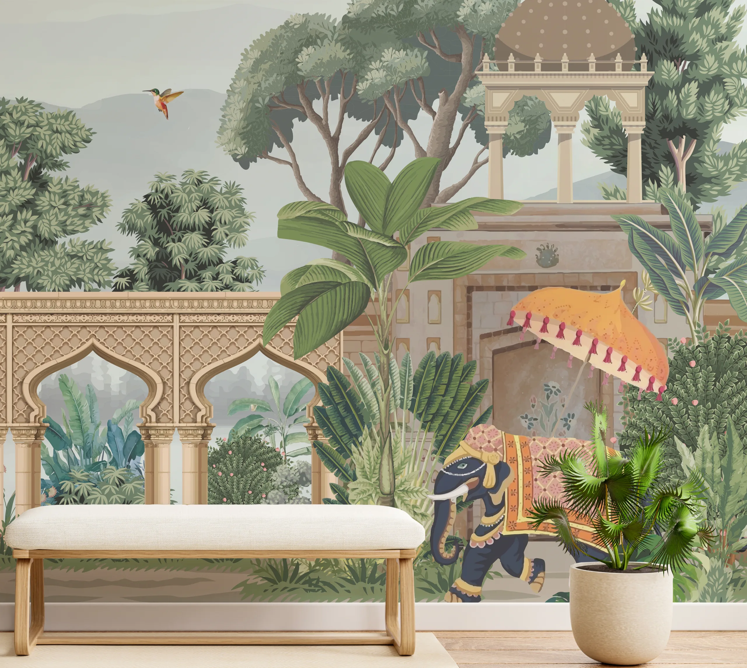 Immerse your home in the timeless elegance of Indian heritage with the Indian Wallpaper, a captivating peel and stick wall covering inspired by traditional palace architecture. The intricate arches, lush greenery, and majestic elephant create a royal ambiance ideal for those who value artistic, cultural, and luxurious wall art.
