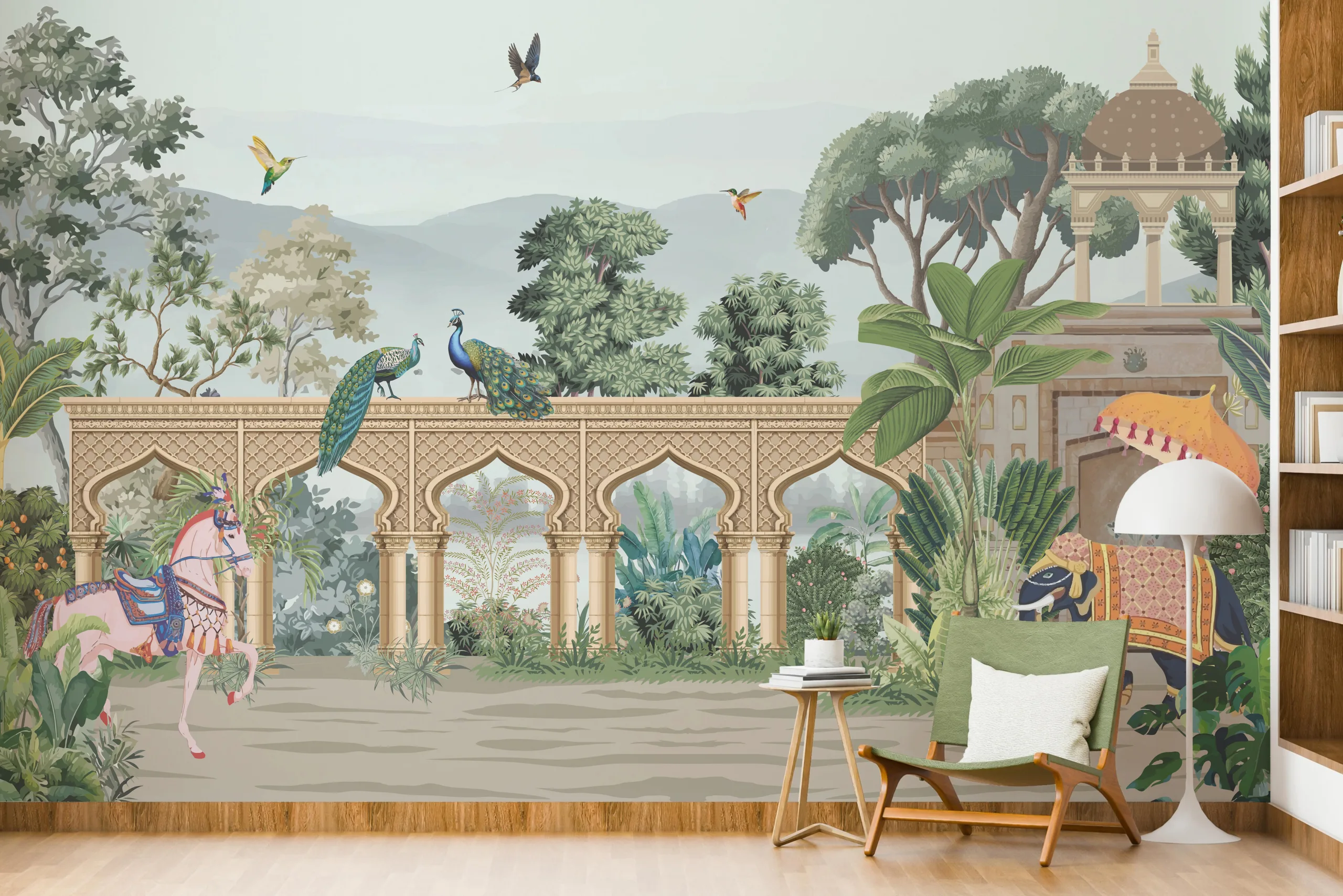 Experience the Beauty of Indian Royal Elephant, Horse and Peacock Peel and Stick Wallpaper