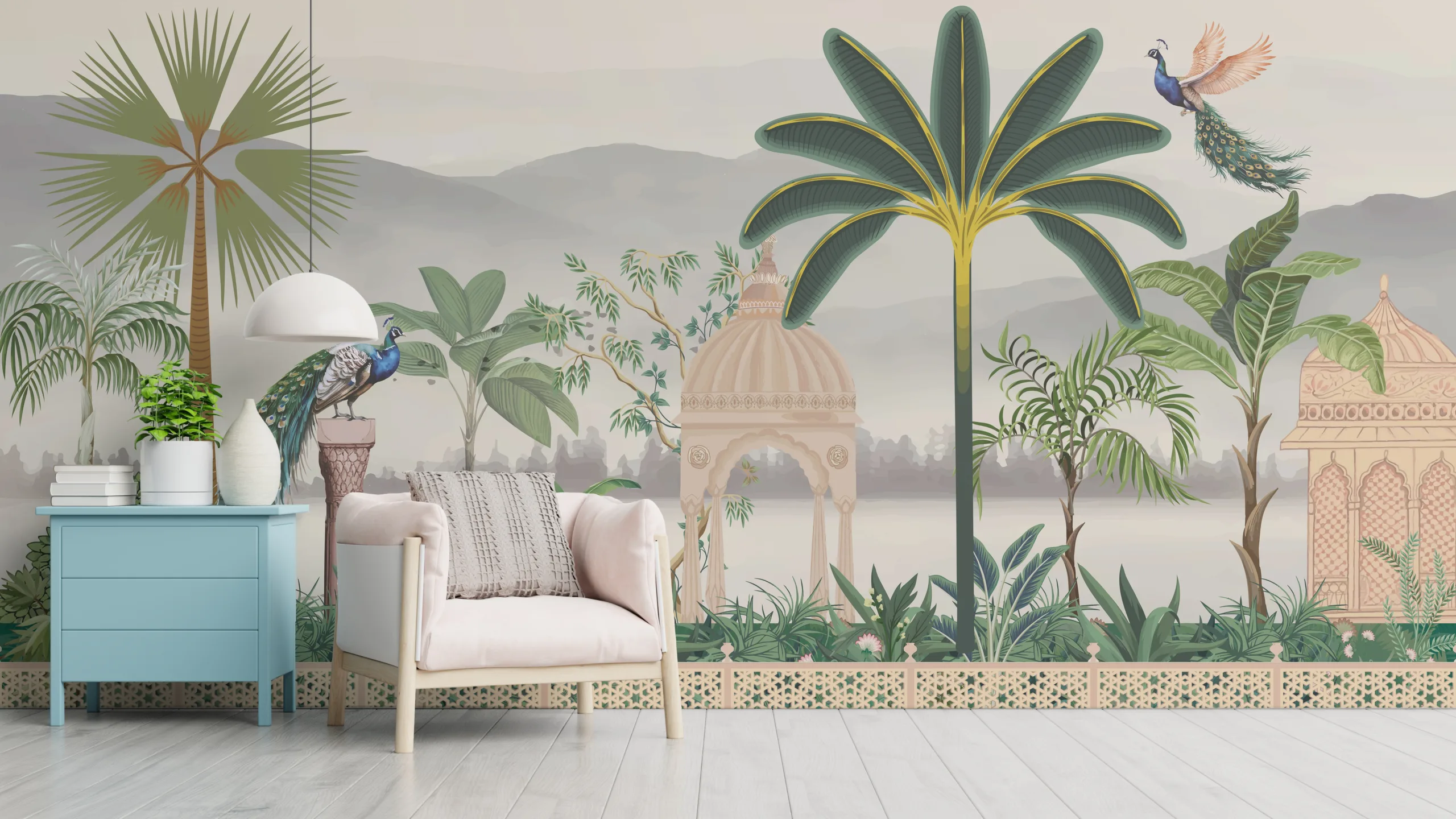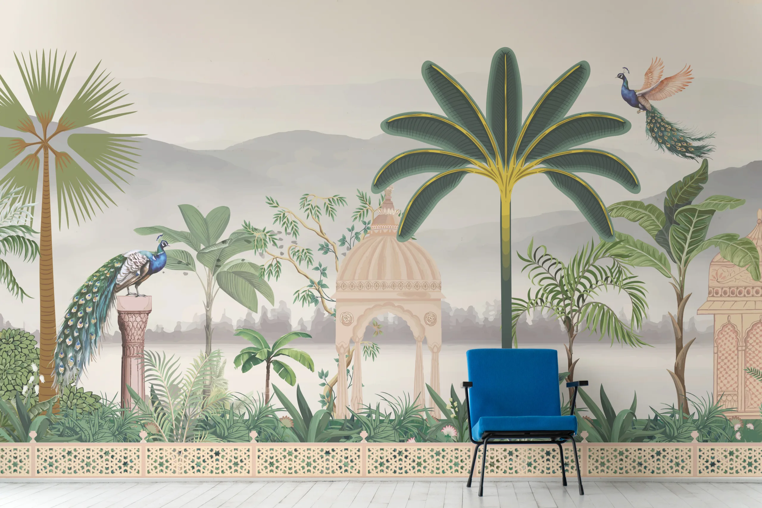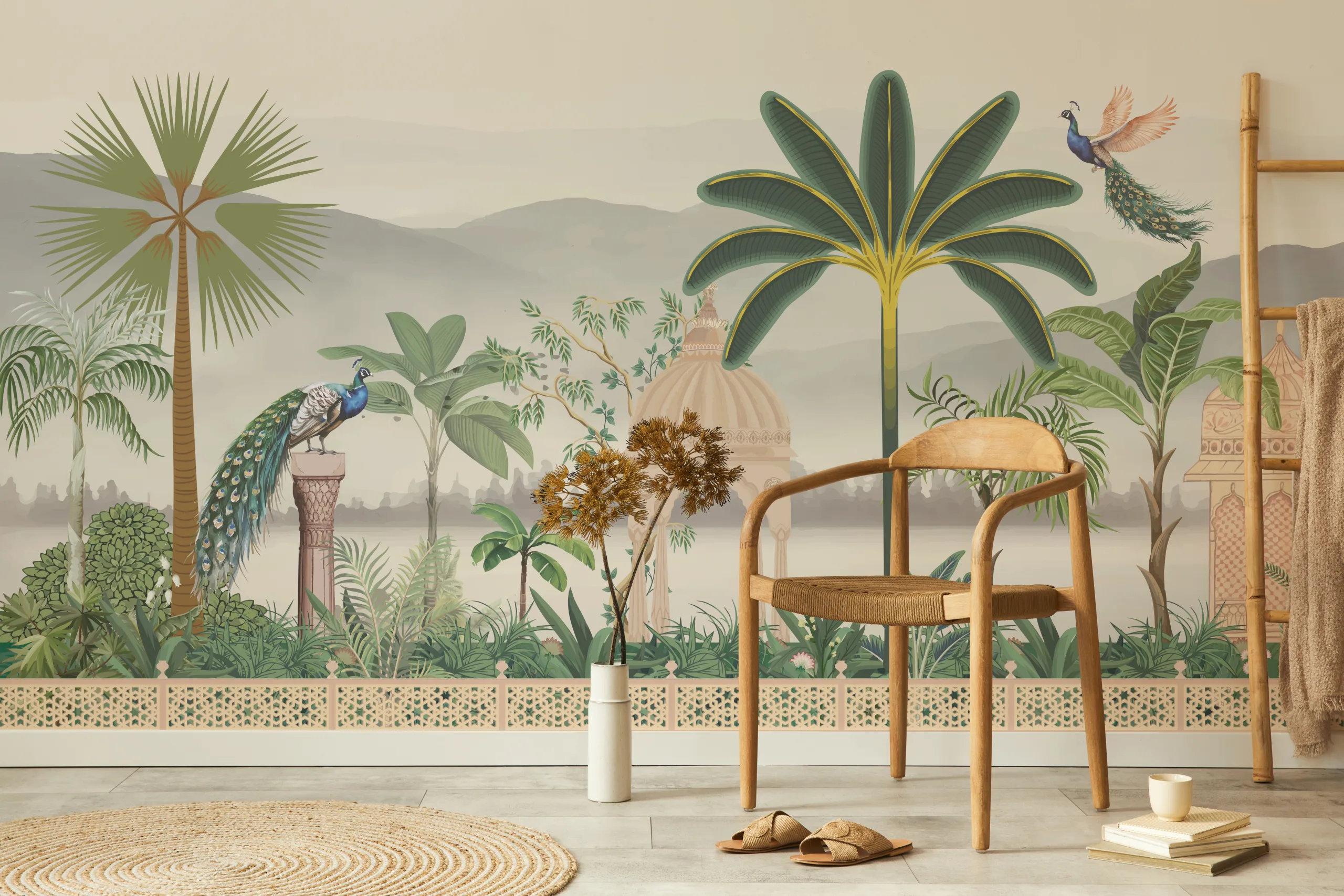 Luxury Mughal Garden | Peacock and Palm Leaves Peel and Stick Wallpaper