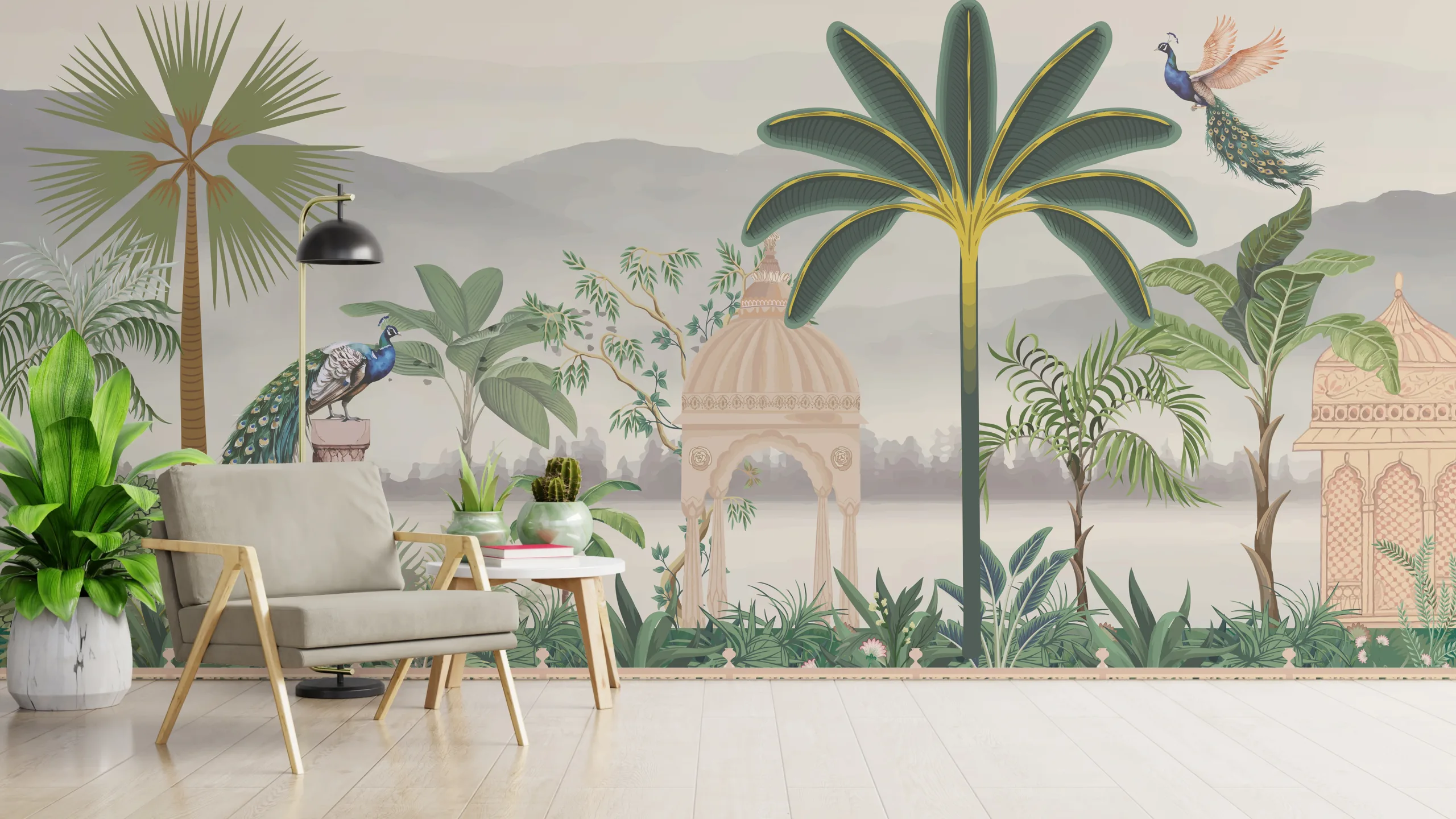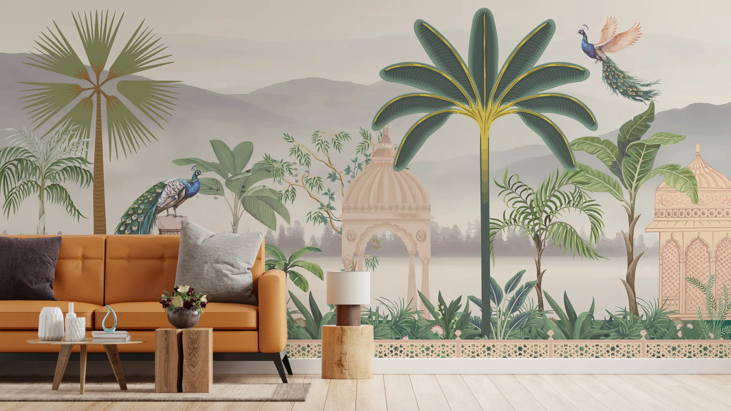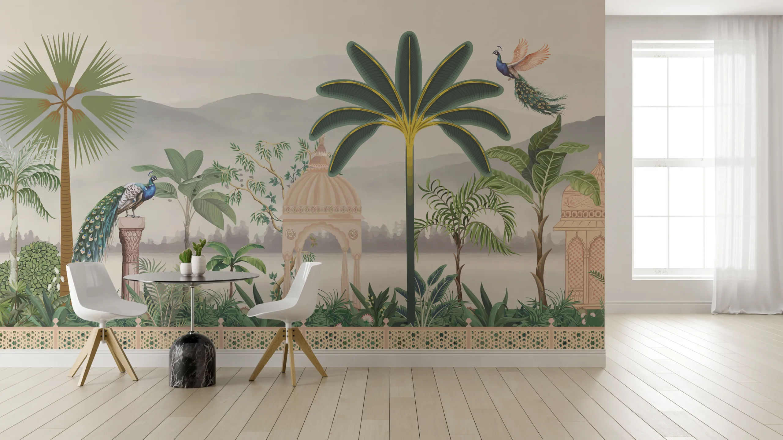 Luxury Mughal Garden | Peacock and Palm Leaves Peel and Stick Wallpaper